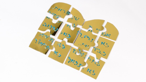 - גוזרים את הבריסטול בצורה המקובלת של לוחות הברית בצד האחורי של הבריסטול משרטטים טבלה בעזרת סרגל. לאחר מכאן מוסיפים לכל ריבוע חצאי עיגול קטנים הפונים פנימה והחוצה ליצירת פאזל.